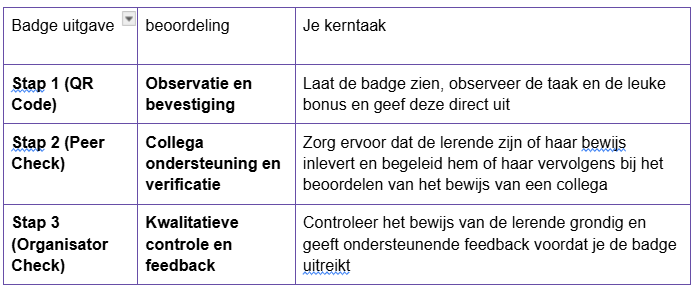 - Je bent verantwoordelijk voor het tonen, observeren, beoordelen en uitgeven van de badges met behulp van drie verschillende methoden.